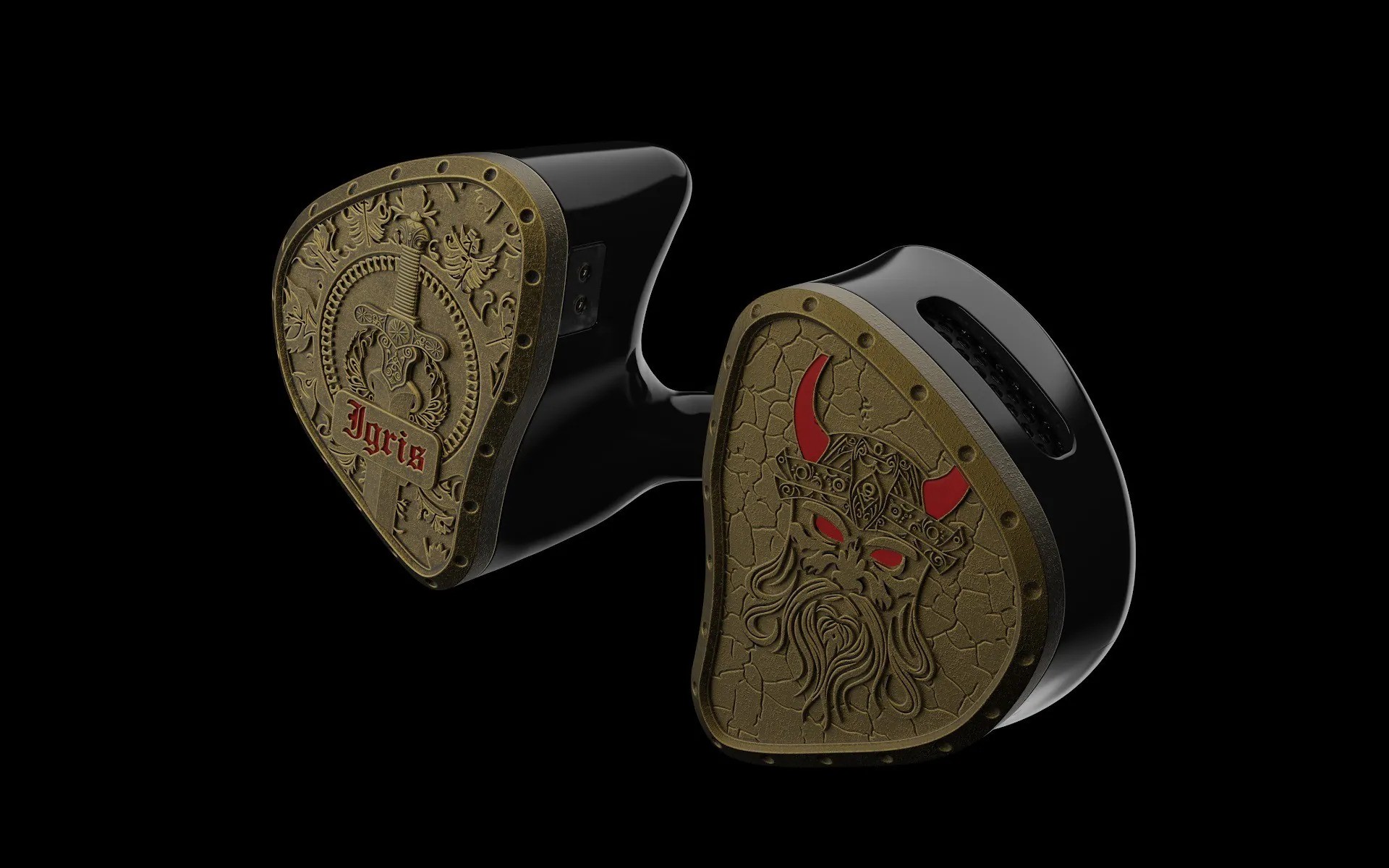 外殼以半透明樹脂構成,內嵌經雷雕與氧化處理的黃銅面板。獨特的古銅質感象徵時間與火的痕跡,每對 Igris 面板紋理皆略有不同,保留手工製作的生命感。側面設有氣流窗結構,改善耳壓並增強音場開闊度,將聲音與工藝融為一體,兼具美學與功能。