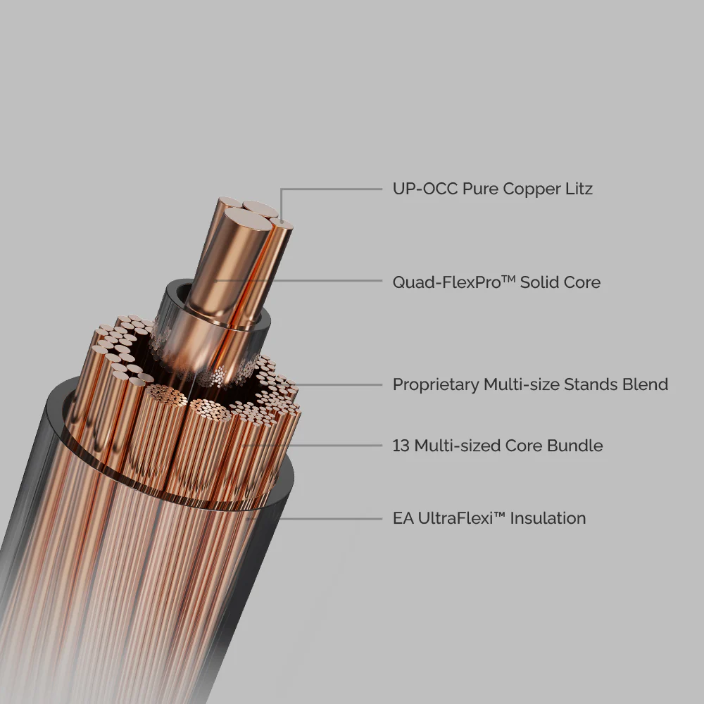 此為第三代實心核心系統,由 2024 年的 Trio-Flex™ 架構演變而來。中央導體現在由四個獨立校準的實心導體組成,每個核心都為其頻率角色進行了精確調
