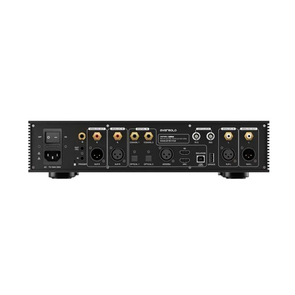 USB 支援 DSD512 / PCM 768 kHz,雙同軸、雙光纖、AES/EBU 及 IIS 輸入皆完全隔離。HDMI ARC / eARC 支援家庭影院,藍牙由 Qualcomm QCC5125 提供高解析串流。耳機輸出最高 1 W,對 16 Ω / 32 Ω 自動增益,但僅提供 6.35 mm 接口。