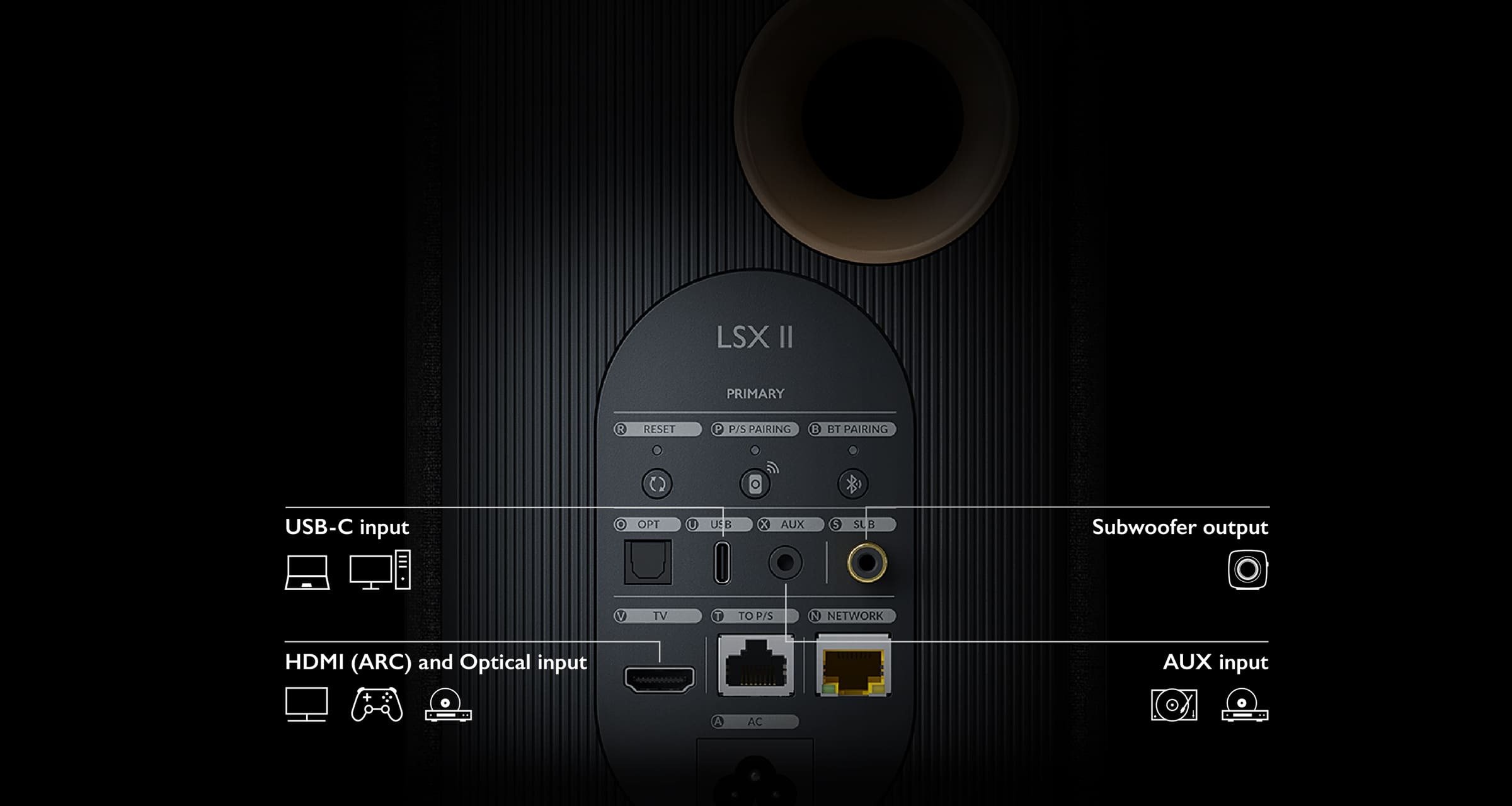 使用LSX II,您可以透過 HDMI ARC 連接電視,透過 USB-C 連接手提電腦,甚至黑膠唱盤、CD 播放器、或遊戲主機。如果想要為電影或音樂加上超強低音,還有專屬輸出孔可連接 KEF 超重低音揚聲器。