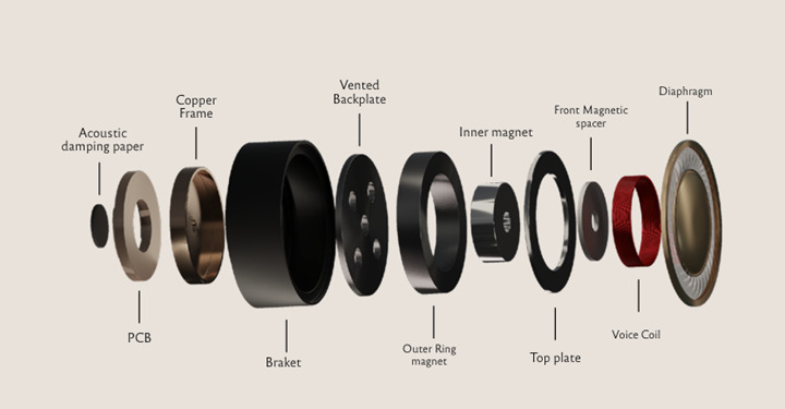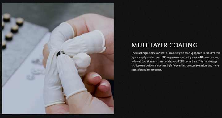 單元採用先進的多層金屬塗層複合振膜技術,10 mm 動圈單元的圓頂由多層黃金塗層組成,PEEK 物料的核心鍍上鈦金屬,再透過物理真空直流磁控濺射技術(Physical Vacuum DC Magnetron Sputtering),在 48 小時過程中施加 80 層超薄黃金塗層。這工藝完美平衡了剛性、速度與共振控制,提供更順滑的高頻延伸及更自然的瞬態響應。