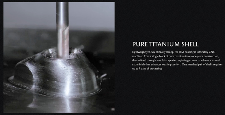 製作腔體過程需耗時 7 天:先由整塊純鈦金屬經精密 CNC 加工成一體式結構,再透過多階段電鍍製程,達成光滑的緞面質感。外殼更加入後通氣孔(Rear Venting)設計,平衡單元與外部壓力,使單元運動更不受限,有效延展超低音輸出(200Hz 以下),同時釋放耳道壓力,實現無疲勞的聆聽體驗。