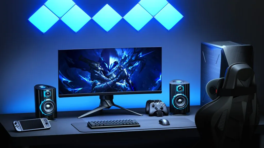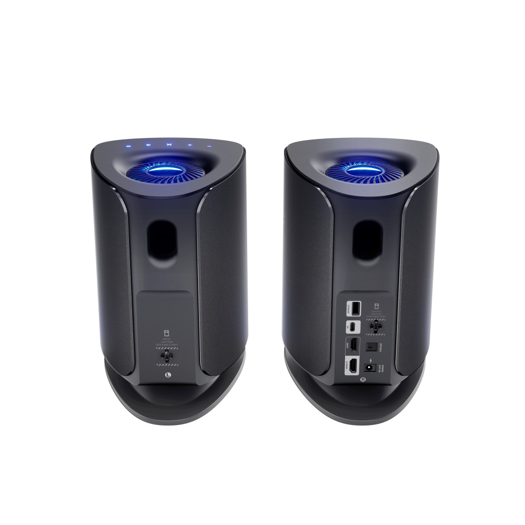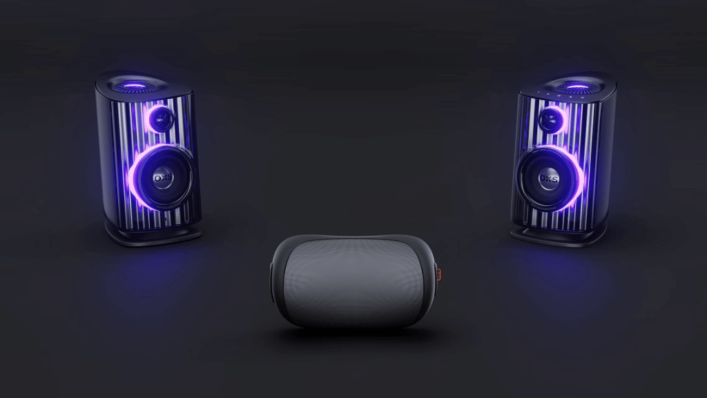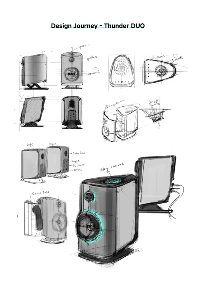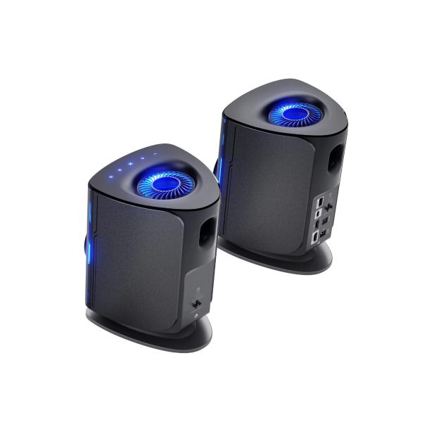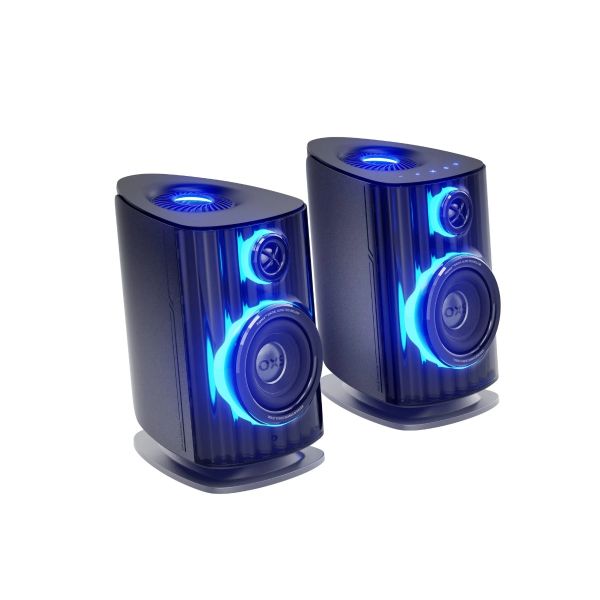 Thunder DUO X 主體喇叭採用獨特的太空船美學設計,流線型機身配合稜角分明的外型,營造充滿未來感的視覺效果。在喇叭前置的半透明機身內,內置三區域 RGB 燈光系統,提供 Vortex(漩渦)、Flame(火焰)、Lightning(閃電)、Flow(流動)、Reflection(反射)五種動態燈光模式,亦可透過 OXS Omni Xspace 應用程式自訂顏色、方向和音樂同步效果。喇叭向上傾斜 8 度設計,確保聲音準確指向聆聽位置。緊湊的書架式設計(7″×8.5″×10.9″)適合放置於桌面,配合 32 吋或以下顯示器使用。