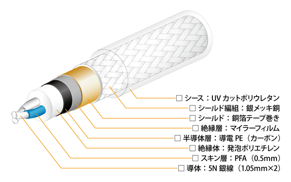 插頭和線纜均採用專為聲學應用設計的「SS-47」無鉛銀焊錫進行焊接。普通焊錫出於成本考慮,錫純度僅為 99.9% (3N)。 「SS-47」採用高純度錫製成,純度高達 99.993% (4N) 或更高,最大限度地去除雜質。此外,還添加了銀和銅,以提高導電性並防止焊錫被腐蝕。